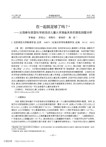 在一起就足够了吗?——父母参与类型与学前流动儿童入学准备关系的潜在剖面分析 = Is being together enough? ——A latent profile analysis of the relationship between parental involvement type and preschool migrant children’s school readiness.