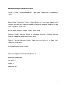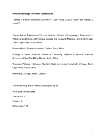 Mycobacterium tuberculosis (M.tb) is a bacterial pathogen that has evolved in humans, and its interactions with the host are complex and best studied in humans. Myriad immune pathways are involved in infection control, granuloma formation, and progression to tuberculosis (TB) disease. Inflammatory cells, such as macrophages, neutrophils, conventional and unconventional T cells, B cells, NK cells, and innate lymphoid cells, interact via cytokines, cell-cell communication, and eicosanoid signaling to contain or eliminate infection but can alternatively mediate pathological changes required for pathogen transmission. Clinical manifestations include pulmonary and extrapulmonary TB, as well as post-TB lung disease. Risk factors for TB progression, in turn, largely relate to immune status and, apart from traditional chemotherapy, interventions primarily target immune mechanisms, highlighting the critical role of immunopathology in TB. Maintaining a balance between effector mechanisms to achieve protective immunity and avoid detrimental inflammation is central to the immunopathogenesis of TB. Many research gaps remain and deserve prioritization to improve our understanding of human TB immunopathogenesis.