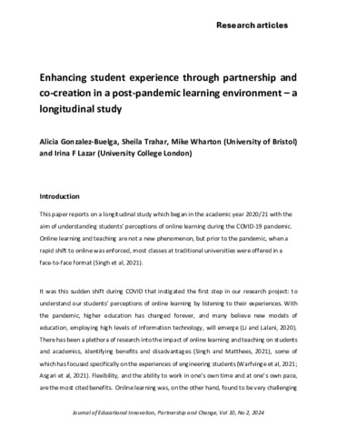 Title: | Enhancing student experience through partnership and co-creation in a post-pandemic learning environment – a longitudinal study |