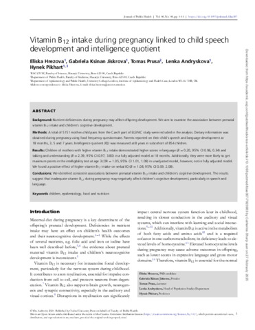 BACKGROUND: Nutrient deficiencies during pregnancy may affect offspring development. We aim to examine the association between prenatal vitamin B12 intake and children's cognitive development. METHODS: A total of 5151 mother-child pairs from the Czech part of ELSPAC study were included in the analysis. Dietary information was obtained during pregnancy using food frequency questionnaire. Parents reported on their child's speech and language development at 18 months, 3, 5 and 7 years. Intelligence quotient (IQ) was measured at 8 years in subcohort of 854 children. RESULTS: Children of mothers with higher vitamin B12 intake demonstrated higher scores in language (B = 0.20, 95% CI 0.06, 0.34) and talking and understanding (B = 2.39, 95% CI 0.97, 3.80) in a fully adjusted model at 18 months. Additionally, they were more likely to get maximum points in the intelligibility test at age 3 (OR = 1.05, 95% CI 1.01, 1.09) in unadjusted model, however, not in fully adjusted model. We found a positive effect of higher vitamin B12 intake on verbal IQ (B = 1.08, 95% CI 0.09, 2.08). CONCLUSIONS: We identified consistent associations between prenatal vitamin B12 intake and children's cognitive development. The results suggest that inadequate vitamin B12 during pregnancy may negatively affect children's cognitive development, particularly in speech and language.