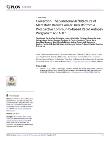 Title: | Correction: The Subclonal Architecture of Metastatic Breast Cancer: Results from a Prospective Community-Based Rapid Autopsy Program "CASCADE" |