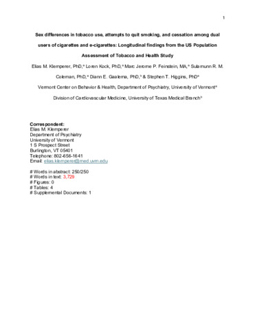 | Title: | Sex differences in tobacco use, attempts to quit smoking, and cessation among dual users of cigarettes and e-cigarettes: Longitudinal findings from the US Population Assessment of Tobacco and Health Study |