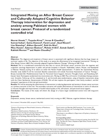 Integrated Moving on After Breast Cancer and Culturally Adapted Cognitive Behavior Therapy intervention for depression and anxiety among Pakistani women with breast cancer: Protocol of a randomized controlled trial.