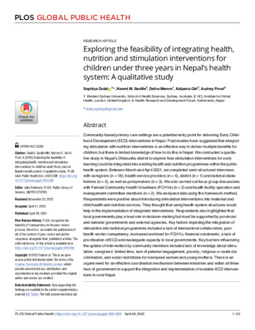 Title: | Exploring the feasibility of integrating health, nutrition and stimulation interventions for children under three years in Nepal’s health system: A qualitative study |