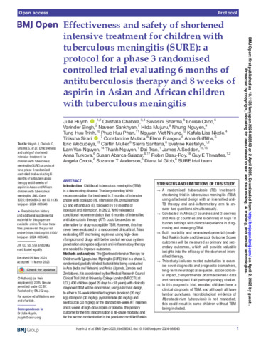 Title: | Effectiveness and safety of shortened intensive treatment for children with tuberculous meningitis (SURE): a protocol for a phase 3 randomised controlled trial evaluating 6 months of antituberculosis therapy and 8 weeks of aspirin in Asian and African children with tuberculous meningitis |