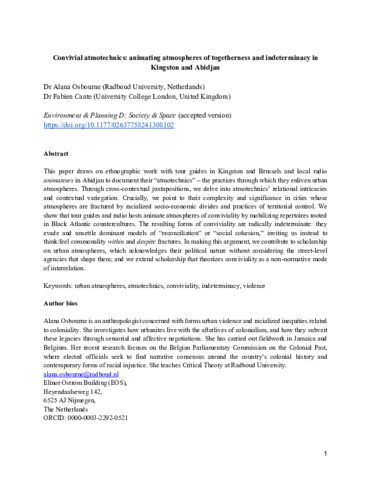 Title: | Convivial atmotechnics: Animating atmospheres of togetherness and indeterminacy in Kingston and Abidjan |