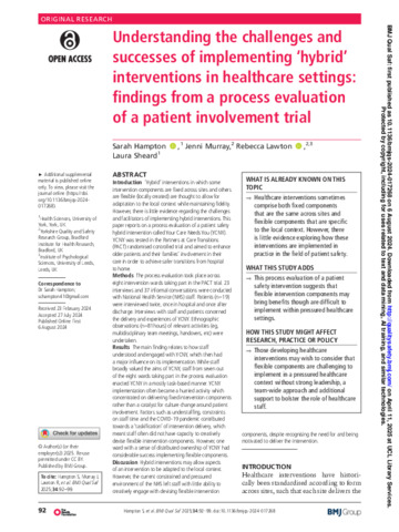 | Title: | Understanding the challenges and successes of implementing ‘hybrid’ interventions in healthcare settings: findings from a process evaluation of a patient involvement trial |