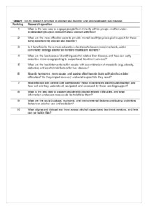 Top ten research priorities for alcohol use disorder and alcohol-related liver disease: results of a multistakeholder research priority setting partnership.