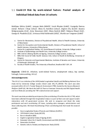 COVID-19 risk by work-related factors: pooled analysis of individual linked data from 14 cohorts.