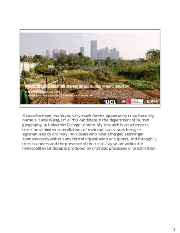In metropolitan Wuhan, a 78-year-old man climbs through a 7m-tall fence, walks up a hill of excavated soil to neat patches of vegetables cultivated in the middle of a construction site that has lain vacant for over a decade. This, he said, is his “kaihuang” – his opening of wasteland. Half a century ago, the old man was also “kaihuang”-ing this land, but as a member of the production brigade in the aftermath of the Cultural Revolution. He planted rice here all his life till, in 2005, the city expropriated the rural fields for urban development, demolished them, but never built upon them. As he kept watch over the land’s second wasting, the old man returned to re-cultivate "his" land in 2018, and has continued to return every year, despite the city's equally persistent demolition of his vegetables . The old man is far from alone. Indeed, since the 1978 reform, China’s cities have expanded over five times beyond their original footprint with the expropriation of rural land accounting for over half of the expanded area. Within this context, an astonishing amount of ordinary people have been quietly re-ruralizing the wasteland of Chinese cities. Presenting remote sensing, social media, and ethnographic data collected at over 100 different sites of kaihuang in the megacities of Guangzhou and Wuhan, this paper examines kaihuang’s simultaneously ordinary and extraordinary ruralization of urbanisation, and the complex clashing of urban crises, rural knowledge, and broader environmental, cultural, and historical concerns in the everyday lives of urbanisation.