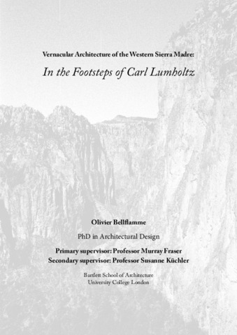 This practice-led PhD by Architectural Design examines the vernacular architecture of the Sierra Madre in northwestern Mexico by recreating the journey of the Norwegian ethnographer, Carl Lumholtz, who in 1890 was the first to photograph its building customs. Combining research methods from architectural history and anthropology, the thesis traces the recent history of Sierra Madran cultural knowledge, observing mutations and losses in traditional architectural practices in comparison to that recorded in photographs and other items held in the Lumholtz Archive at the American Museum of Natural History. Extensive fieldwork pursued across remote trails in Mexico is compiling a brand new archive that, when completed, will provide cultural testimony both for local people and architects/scholars. The context for this thesis is thus multiple, navigating from the archives of Carl Lumholtz to onsite explorations in Mexico, and from this fieldwork to the archive that I will be producing today, approximately 120 years later. The ambition of the research project is hence to participate in an ongoing history of vernacular architecture of the Western Sierra Madre by treating the idea of an archive as living, creative testimony. Once it is put beside the Lumholtz collection, this study will offer a time-based perspective stretching from his original explorations until today.