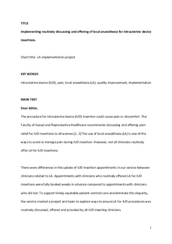 | Title: | Implementing routinely discussing and offering local anaesthesia for intrauterine device insertions |