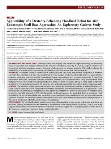 | Title: | Applicability of a Dexterity-Enhancing Handheld Robot for 360° Endoscopic Skull Base Approaches: An Exploratory Cadaver Study |