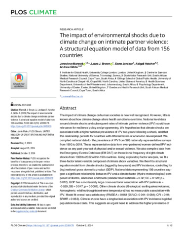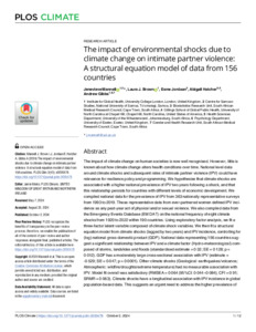 Title: | The impact of environmental shocks due to climate change on intimate partner violence: A structural equation model of data from 156 countries |