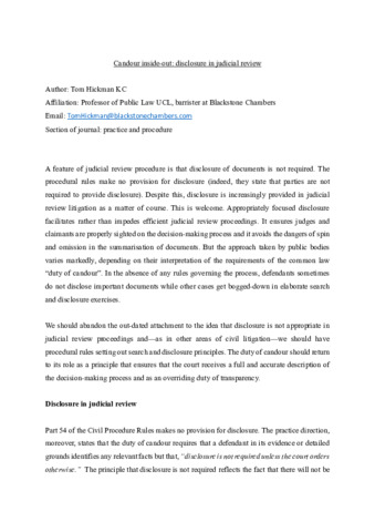 | Title: | Candour Inside-Out: Disclosure in Judicial Review |