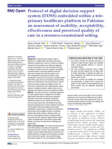 Protocol of digital decision support system (DDSS) embedded within a tele-primary healthcare platform in Pakistan: an assessment of usability, acceptability, effectiveness and perceived quality of care in a resource-constrained setting.