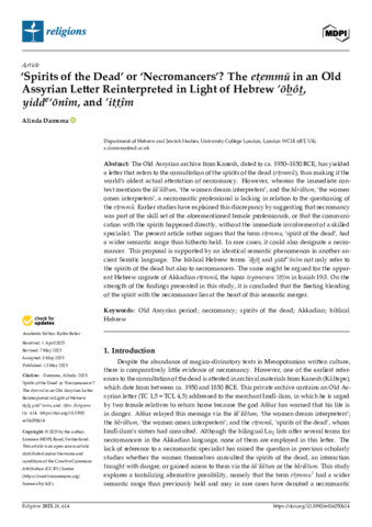 Title: | ‘Spirits of the Dead’ or ‘Necromancers’? The eṭemmū in an Old Assyrian Letter Reinterpreted in Light of Hebrew ’ōbôt, yidde‘ōnîm, and ’iṭṭîm |