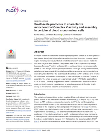 | Title: | Small-scale protocols to characterize mitochondrial Complex V activity and assembly in peripheral blood mononuclear cells |