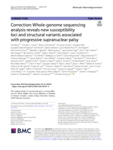 | Title: | Correction: Whole-genome sequencing analysis reveals new susceptibility loci and structural variants associated with progressive supranuclear palsy |