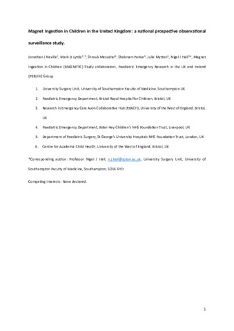 | Title: | Magnet ingestion in children in the United Kingdom: a national prospective observational surveillance study |
