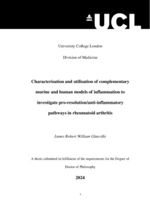 | Title: | Characterisation and utilisation of complementary murine and human models of inflammation to investigate pro-resolution/anti-inflammatory pathways in rheumatoid arthritis |