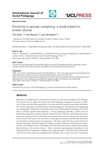 Research on caregiving has traditionally focused on coping with negative life changes. This article aims to widen the scope from the challenges caregivers encounter in their lives to the emotions they experience in caring, and the situations associated with them. The article’s approach is predominantly social pedagogical. We discuss social pedagogy as a pedagogical theoretical orientation and a way of thinking that emphasise the social basis of human growth and education. Social pedagogy provides a useful lens for examining caregivers’ personal growth, especially how inclusion, well-being and social functional capacity can be promoted, thus preventing and alleviating social exclusion. In this article, the focus is on emotions in everyday encounters and relations that have an important coping function for caregivers. The data came from the written stories of spouse caregivers, and the method of analysis was joint abductive and inductive content analysis. A modified version of the Basic Emotion Scale was used to identify and classify the emotions in the written stories. These emotions were grouped according to the following themes: happiness, sadness, fear, anger and guilt. The encounters associated with the emotions were also analysed and classified. As a result, the role of emotions as key markers of well-being and important life changes was discovered. Emotions are important indicators that show us what needs special attention in everyday caregiving encounters. This information can be used by social and health-care professionals seeking ways to support and empower caregivers.