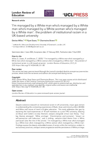 Title: | ‘I’m managed by a White man who’s managed by a White man who’s managed by a White woman who’s managed by a White man’: the problem of institutional racism in a UK-based university |