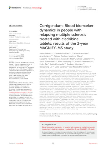 | Title: | Corrigendum: Blood biomarker dynamics in people with relapsing multiple sclerosis treated with cladribine tablets: results of the 2-year MAGNIFY-MS study |