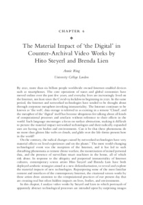 In response to the ubiquity and purported immateriality of Internet cultures, contemporary screen artists Hito Steyerl and Brenda Lien have both deployed aesthetic strategies aimed at a new defamiliarisation, to reveal and explore the material impacts of new technologies. Repurposing some of the most familiar content and interfaces of the contemporary Internet, the citational screen works by these artists draw attention to the computational practices of our present day that are creating real but often hidden impacts on lives, bodies, and environments. Ring analyses video works by Steyerl and Lien in which portrayals of apparently abstract technological processes are intruded upon by surprising images of materiality.