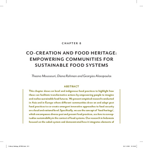 This chapter draws on local and indigenous food practices to highlight how these can facilitate transformative actions by empowering people to imagine and realise sustainable food futures. We present empirical research conducted in Asia and in Europe where different communities draw on and adapt past food practices to co-create emergent innovative approaches to food security on a local and national level. Specifically, we use the concept of ‘food heritage’, which encompasses diverse past and present food practices, as a lens to conceptualise sustainability in the context of food systems. Our research in Indonesia focused on the subak system and demonstrated how it integrates elements of indigenous agricultural knowledge and modern techniques to foster agricultural sustainability. It also highlighted the power of co-creation through paruman in apprehending the challenges faced by the local community and devising sustainable solutions. Co-creation in the European context, as applied by the BigPicnic project, enabled local communities to share their food practices, expanded the boundaries of botanic garden professionals’ knowledge about their collection of plants and enriched their interpretation through integrating local and indigenous knowledge into canonical natural history knowledge. Employing the FAO’s (Food and Agriculture Organization) entry points framework for transformative change towards sustainable food and agricultural systems we discuss the potential of food heritage for supporting innovation and sustainability.