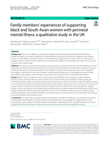 | Title: | Family members’ experiences of supporting black and South Asian women with perinatal mental illness: a qualitative study in the UK |