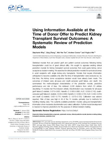 Title: | Using Information Available at the Time of Donor Offer to Predict Kidney Transplant Survival Outcomes: A Systematic Review of Prediction Models |