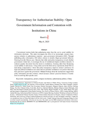 Title: | Transparency for Authoritarian Stability: Open Government Information and Contention with Institutions in China |