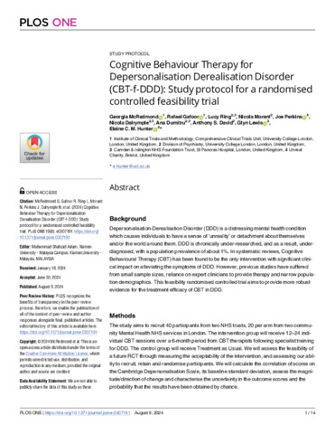 Cognitive Behaviour Therapy for Depersonalisation Derealisation Disorder (CBT-f-DDD): Study protocol for a randomised controlled feasibility trial.