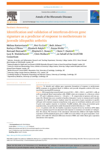 Identification and validation of interferon-driven gene signature as a predictor of response to methotrexate in juvenile idiopathic arthritis.