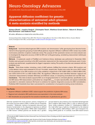 | Title: | Apparent diffusion coefficient for genetic characterisation of untreated adult gliomas: a meta-analysis stratified by methods |