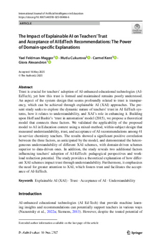Title: | The Impact of Explainable AI on Teachers’ Trust and Acceptance of AI EdTech Recommendations: The Power of Domain-specific Explanations |