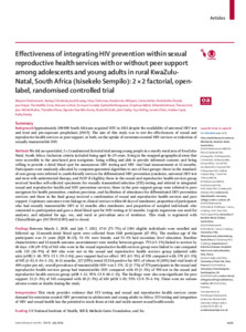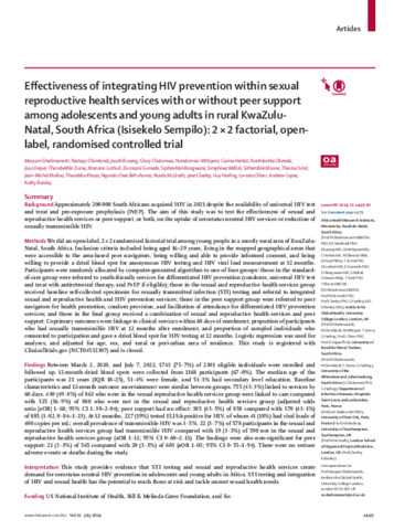 Title: | Effectiveness of integrating HIV prevention within sexual reproductive health services with or without peer support among adolescents and young adults in rural KwaZuluNatal, South Africa (Isisekelo Sempilo): 2 x 2 factorial, openlabel, randomised controlled trial |