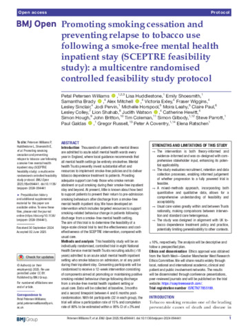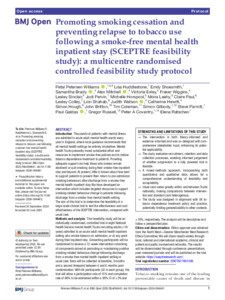 | Title: | Promoting smoking cessation and preventing relapse to tobacco use following a smoke-free mental health inpatient stay (SCEPTRE feasibility study): a multicentre randomised controlled feasibility study protocol |
