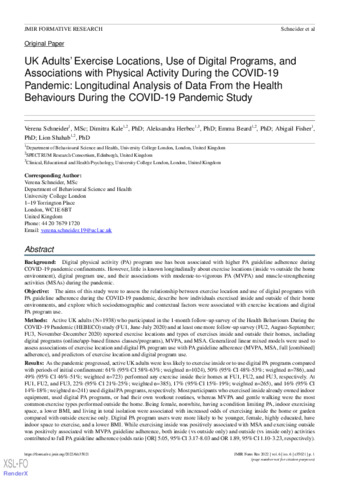 Title: | UK Adults' Exercise Locations, Use of Digital Programs, and Associations with Physical Activity During the COVID-19 Pandemic: Longitudinal Analysis of Data From the Health Behaviours During the COVID-19 Pandemic Study |