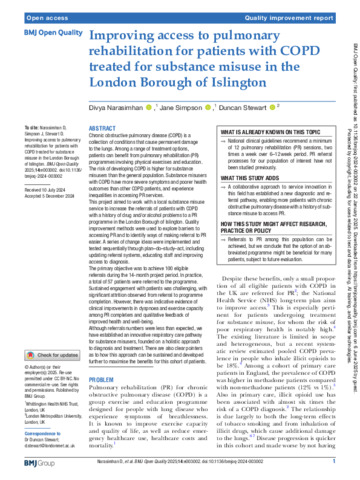 Title: | Improving access to pulmonary rehabilitation for patients with COPD treated for substance misuse in the London Borough of Islington |