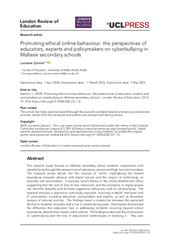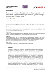 Title: | Promoting ethical online behaviour: the perspectives of educators, experts and policymakers on cyberbullying in Maltese secondary schools |