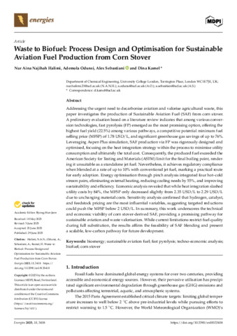 Title: | Waste to Biofuel: Process Design and Optimisation for Sustainable Aviation Fuel Production from Corn Stover |