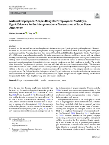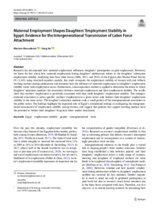 Title: | Maternal Employment Shapes Daughters’ Employment Stability in Egypt: Evidence for the Intergenerational Transmission of Labor Force Attachment |