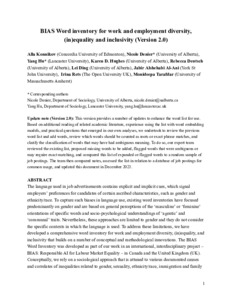 This version provides a number of updates to enhance the word list for use. Based on additional reading of related academic literature, experience using the list with word embedding models, and practical questions that emerged in our own analyses, we undertook to review the previous word list and add words, review which words should be counted as roots or exact phrase matches, and clarify the classification of words that may have had ambiguous meaning. To do so, our expert team reviewed the existing list, proposed missing words to be added, flagged words that were ambiguous or may require exact matching, and compared this list of expanded or flagged words to a random sample of job postings. The team then compared notes, assessed the list in relation to a database of job postings for common usage, and updated this document in December 2023. // ABSTRACT: The language used in job advertisements contains explicit and implicit cues, which signal employers’ preferences for candidates of certain ascribed characteristics, such as gender and ethnicity/race. To capture such biases in language use, existing word inventories have focused predominantly on gender and are based on general perceptions of the ‘masculine’ or ‘feminine’ orientations of specific words and socio-psychological understandings of ‘agentic’ and ‘communal’ traits. Nevertheless, these approaches are limited to gender and they do not consider the specific contexts in which the language is used. To address these limitations, we have developed a comprehensive word inventory for work and employment diversity, (in)equality, and inclusivity that builds on a number of conceptual and methodological innovations. The BIAS Word Inventory was developed as part of our work in an international, interdisciplinary project – BIAS: Responsible AI for Labour Market Equality – in Canada and the United Kingdom (UK). Conceptually, we rely on a sociological approach that is attuned to various documented causes and correlates of inequalities related to gender, sexuality, ethnicity/race, immigration and family statuses in the labour market context. Methodologically, we rely on ‘expert’ coding of actual job advertisements in Canada and the UK, as well as iterative cycles of inter-rater verification. These expert codings can be paired with natural language processing (NLP) techniques and word embeddings from large language models (LLM) to further expand the list. Our inventory is particularly suited for studying labour market inequalities, as it reflects the language used to describe job postings, and the inventory takes account of cues at various dimensions, including explicit and implicit cues associated with gender, ethnicity, citizenship and immigration statuses, role specifications, equality, equity and inclusivity policies and pledges, work-family policies, and workplace context.