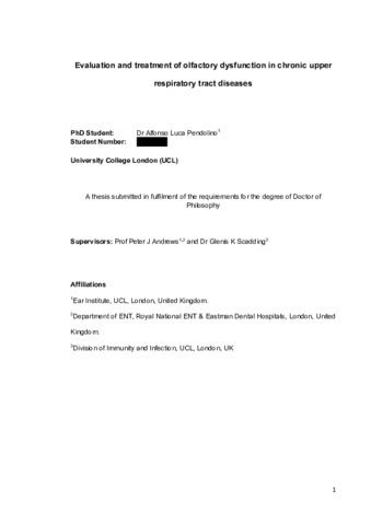 Background: Olfactory dysfunction (OD) represents a common problem in chronic upper respiratory diseases; however, prevalence and treatment options remain poorly understood. Aims: To evaluate OD in terms of prevalence and severity in three types of chronic upper respiratory disease: 1. Non-steroidal anti-inflammatory drugs (NSAIDs)-exacerbated respiratory disease (N-ERD) 2. Sleep-disordered breathing (SDB) 3. Post-infectious olfactory dysfunction (mainly on patients with COVID-19-related OD – C19OD). To assess the efficacy and effectiveness of currently available and new treatments in these three diseases including intranasal lysine aspirin (LAS) for N-ERD, radiofrequency of inferior turbinates (RFITs) for SDB and functional septorhinoplasty (fSRP) for C19OD. This is based on the hypothesis that an increase in nasal airflow and/or control of local inflammation can lead to improved olfaction. Methods: Ten research studies were conducted for this PhD project: 2 retrospective cohort studies, 4 cross-sectional analyses, 2 prospective non-controlled cohort studies and 2 prospective-controlled cohort studies. Results: OD is highly prevalent amongst N-ERD (81.8%), SDB (23.5%) and C19OD patients (prevalence variable on studies). Long-term use of LAS in N-ERD was associated with improved olfaction (p=0.048), nasal airflow (p<0.001) and quality of life (QoL – p=0.02) when compared to those not using it. RFITs in SDB subjects significantly improved nasal airways (p<0.02) and OD, the latter not significantly. Persistent C19OD significantly affects QoL (p<0.05). Corticosteroids plus olfactory training (OT) can significantly improve measured and reported olfaction (p=0.01 for both) in medium-term C19OD (~7 months). In patients with long-term (>2years) C19OD, fSRP can significantly restore olfaction (p<0.05) when compared to OT. Conclusion: My research offers new insights in the treatment of OD in N-ERD, SDB and PIOD patients while suggesting new potential therapeutic options through the management of local sinonasal inflammation and/or nasal airways optimisation. My findings will encourage future research and assist in the development of new treatments for smell loss.