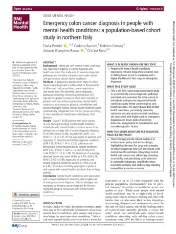 Title: | Emergency colon cancer diagnosis in people with mental health conditions: a population-based cohort study in northern Italy |