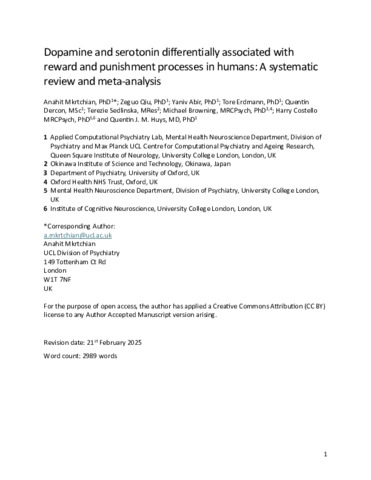 Differential Associations of Dopamine and Serotonin With Reward and Punishment Processes in Humans: A Systematic Review and Meta-Analysis.