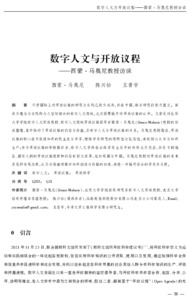 尽管国际上对开放议程的研究与实践已较为成熟,但在中国,相关研究仍较为匮乏。 而 作为理念与实践均与之密切相关的数字人文领域,尤其需要提升对开放议程的认识。 文章是对伦敦 大学学院数字人文荣休教授、数字人文领域开放议程倡导者西蒙·马奥尼( Simon Mahony)教授的访 谈整理,集中探讨了开放议程的内容与价值,及数字人文与开放议程的关系。 马奥尼教授指出,开放 议程的核心在于促进知识的民主化与共享,增强学术研究的透明性与包容性,并鼓励公众参与知识 生产;作为开放议程的积极推动者,数字人文学科在全球学术生态中的作用尤为突出,但是不同地 区、国家之间的开放议程进度和内容有较大差异,比如英国与中国。 马奥尼教授对开放议程的未来 发展持乐观态度,认为其将继续推动知识创造与传播的加速,并进一步提升社会的学术参与度。