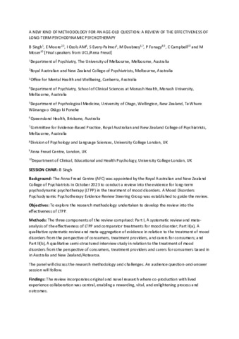Background: The Anna Freud Centre (AFC) was appointed by the Royal Australian and New Zealand College of Psychiatrists in October 2023 to conduct a review into the evidence for long-term psychodynamic psychotherapy (LTPP) in the treatment of mood disorders. A Mood Disorders Psychodynamic Psychotherapy Evidence Review Steering Group was established to guide the review. / / Objectives: To explore the research methodology undertaken to develop the review into the effectiveness of LTPP. / / Methods: The three components of the review comprised: Part I, a systematic review and meta-analysis of the effectiveness of LTPP and comparator treatments for mood disorder; Part II(a), a qualitative systematic review and meta-aggregation of evidence in relation to the treatment of mood disorders from the perspective of consumers, treatment providers, and carers for consumers; and Part II(b), a qualitative semi-structured interview study in relation to the treatment of mood disorders from the perspective of consumers, treatment providers and carers for consumers based in Australia and New Zealand/Aotearoa. The panel will discuss the research methodology and challenges. An audience question-and-answer session will follow. / / Findings: The review incorporates original and novel research where co-production with lived experience collaboration was central, enabling a rewarding, vital, and enlightening process and outcomes. / / Conclusion: Collectively, the three interrelated studies indicate that LTPP is an effective treatment for some individuals with mood disorders. Lived experience is acknowledged as an important aspect to improving understanding of the effectiveness of this treatment.